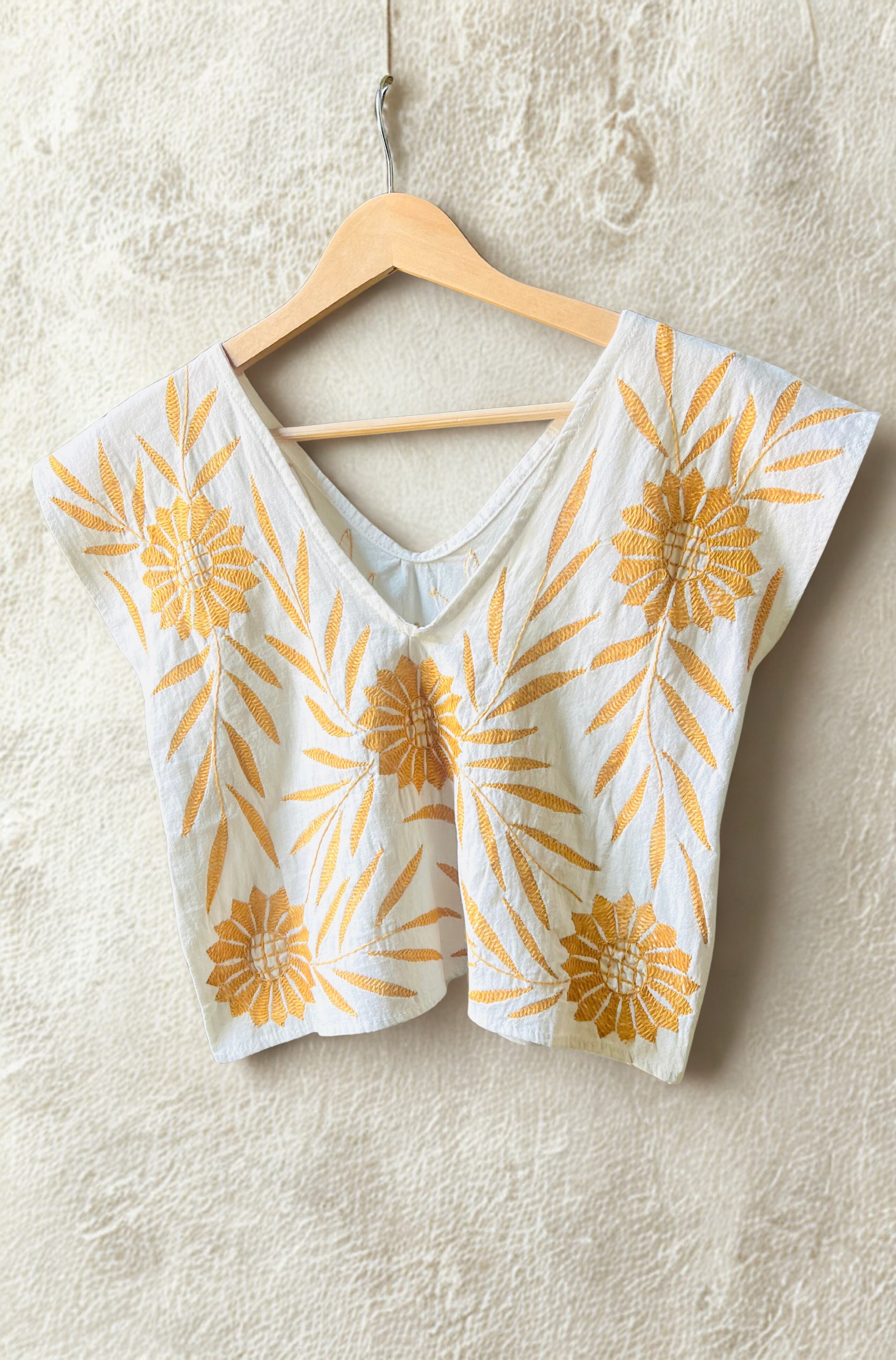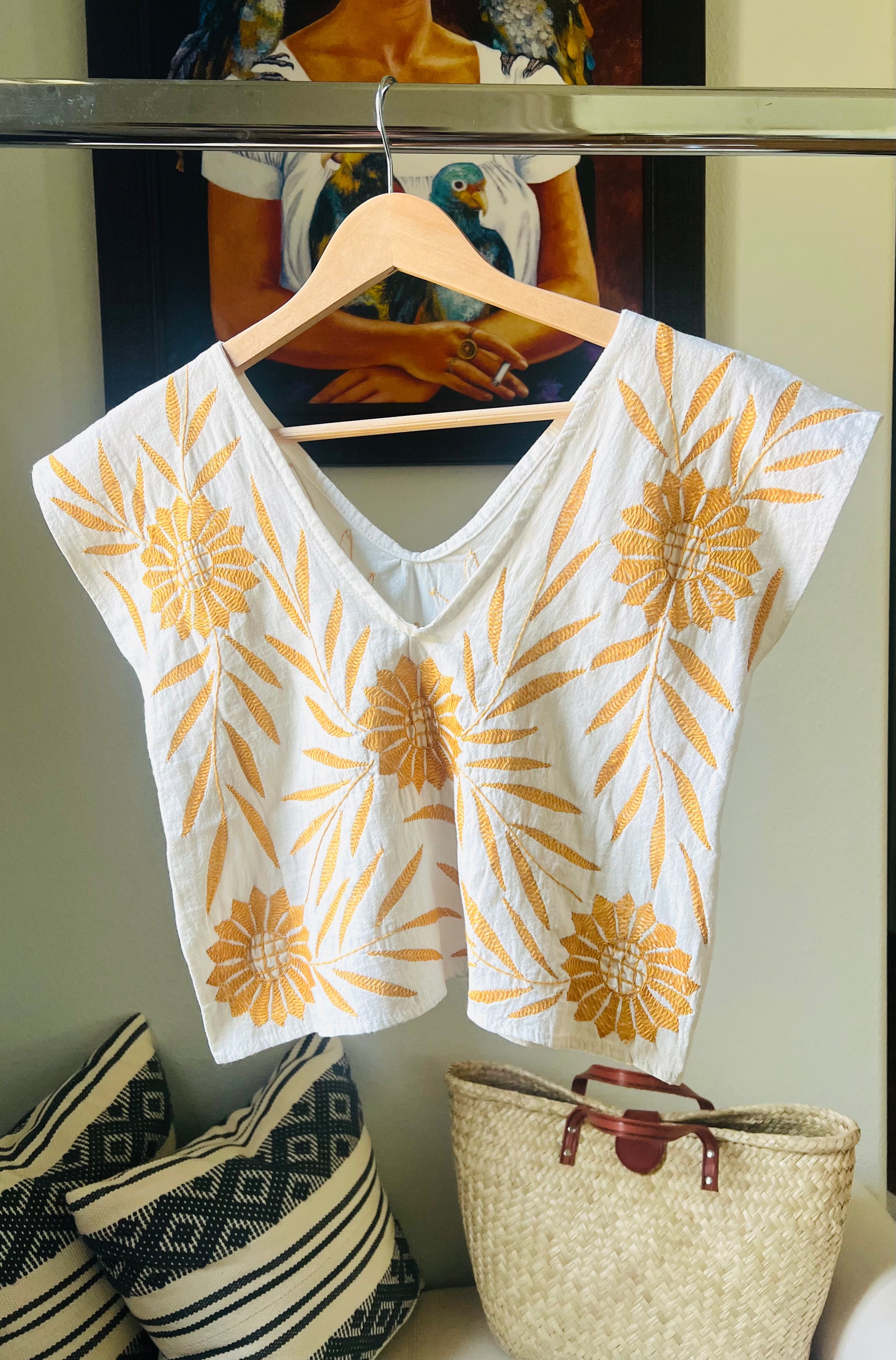 Stitched on breathable, textured cotton, this blouse is as comfortable as it is meaningful. The slightly cropped, boxy fit and V-neckline make it a beautiful statement piece on its own or layered.