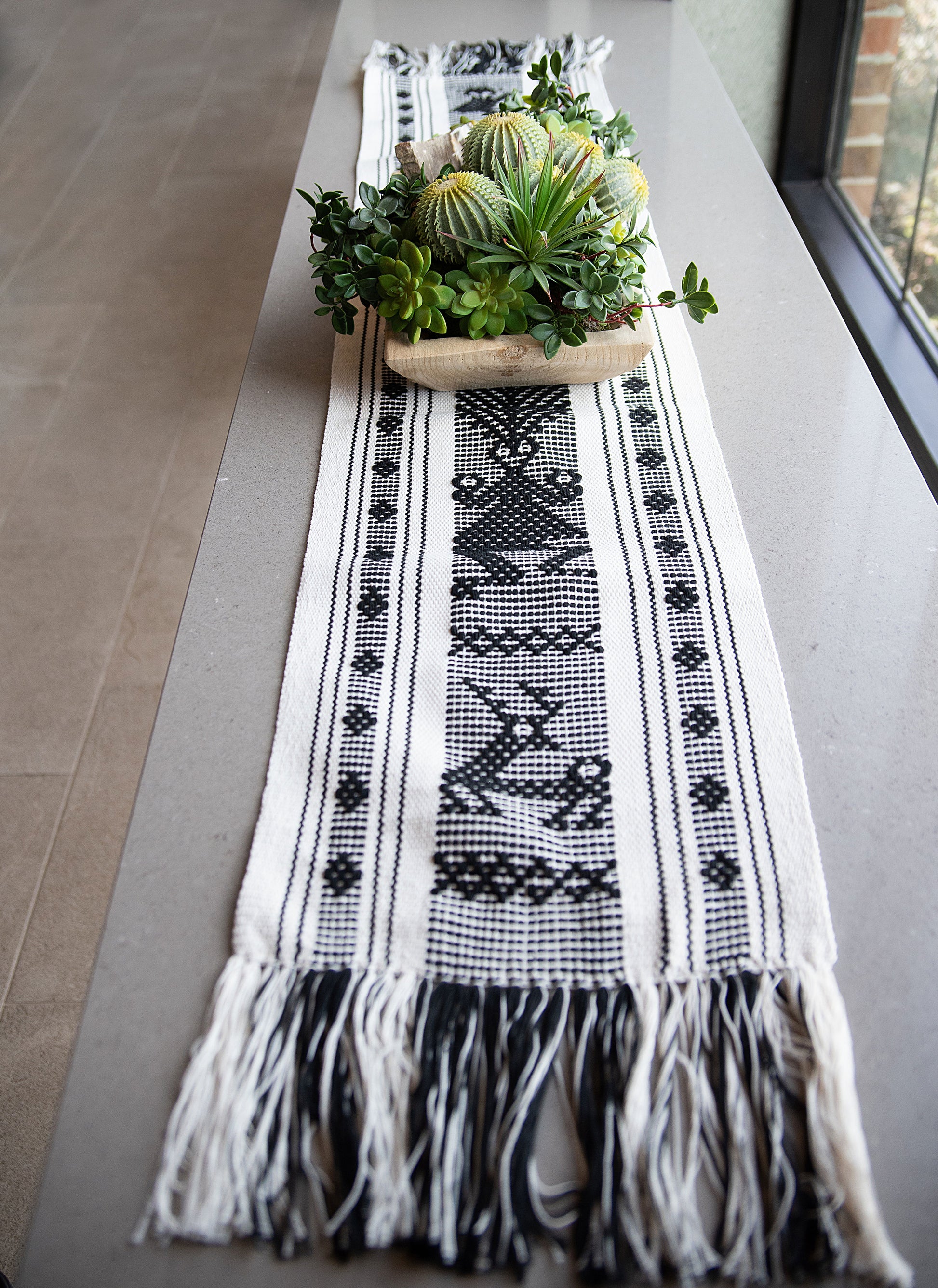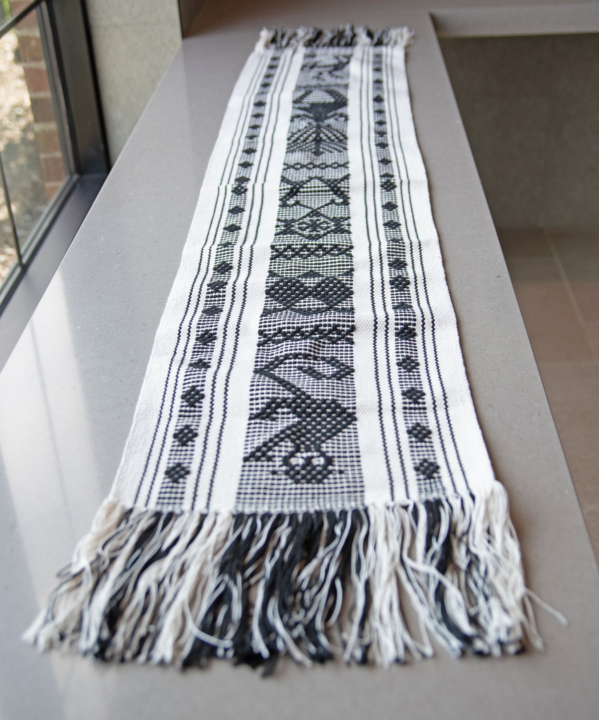 Handwoven with textured cotton using the traditional back strap loom technique, this table runner adds a touch of tradition and elegance to any table setting. Transform your dining experience with this beautiful and unique piece.